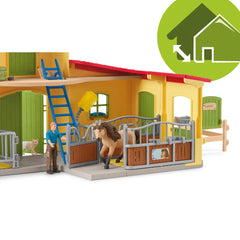 The spirited Iceland Pony loves to ride out and gallop across the meadows. But even more than that, it loves to come home afterwards and rest in its cozy box. This is its home where it has everything it needs. There are even a few crunchy green apples ready in the trough. Mmmh, delicious! His favorites! I wonder who put them there? By the way, the cozy pony box can be combined with the separately available large stable.